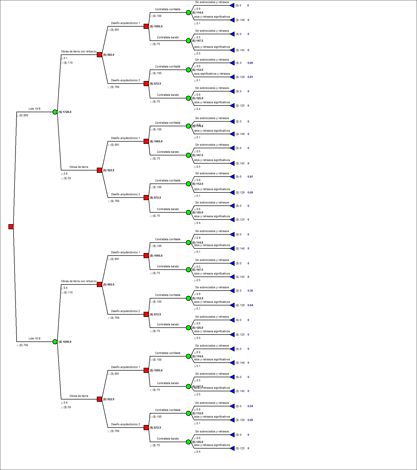 Este estudio presenta un caso de aplicación de árboles de decisión en la evaluación y selección del plan de inversión óptimo para la compra de un lote en Ruitoque Condominio, ubicado en el área metropolitana de Bucaramanga. Este caso de aplicación emplea la metodología de árboles de decisión conforme a la práctica recomendada AACE 85R-14. El análisis se centró en dos lotes específicos: Lote 19B en Floridablanca y Lote 16B en Piedecuesta del conjunto GREEN HOUSE, evaluando diversos criterios y variables relacionados con factores económicos, geográficos y de calidad de vida. Entre los criterios más importantes se incluyeron la estabilidad del terreno, dos diferentes diseños arquitectónicos y la selección entre un contratista confiable y uno barato. Mediante la implementación de un árbol de decisión, se determinaron las probabilidades de éxito y fracaso para cada opción de inversión, basado en el juicio de expertos. Los resultados indicaron que el Lote 16B, con un costo de 700 millones, es la mejor opción debido a su menor probabilidad de problemas de estabilidad del terreno, utilizando el segundo diseño arquitectónico y al contratista confiable. Este enfoque no solo proporciona un análisis exhaustivo y sistemático para la toma de decisiones en inversiones inmobiliarias, sino que también subraya la importancia de considerar múltiples factores y riesgos asociados con la construcción y desarrollo de viviendas.