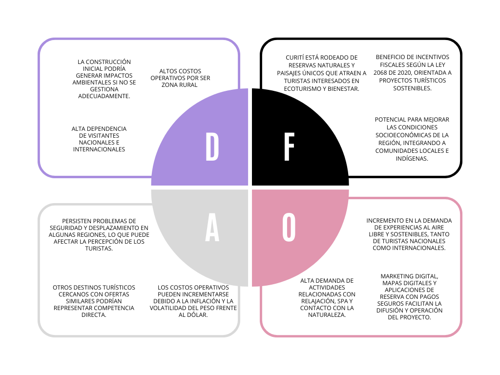 El proyecto consiste en un plan de negocios para la creación de un Hotel-Spa con diseño tipo Chalet Suizo ubicado en la zona rural de Curití, Santander. Su objetivo es ofrecer una experiencia única que combine ecoturismo y turismo de bienestar, integrando servicios como spa, gastronomía local y actividades al aire libre en un entorno natural. Se enfoca en aprovechar el creciente interés por el bienestar y la sostenibilidad, así como la riqueza ambiental de la región, para atraer turistas nacionales e internacionales. El análisis abarca aspectos de mercado, técnicos, financieros, legales, organizacionales y ambientales, demostrando la viabilidad del proyecto y su potencial para generar empleo y dinamizar la economía local. Los resultados financieros proyectan rentabilidad positiva, mientras que las estrategias propuestas, como el uso de marketing digital y prácticas sostenibles, buscan posicionarlo competitivamente en un sector en auge, respaldado por el aumento del 32.3% en visitantes no residentes en 2023 según el Ministerio de Comercio, Industria y Turismo.